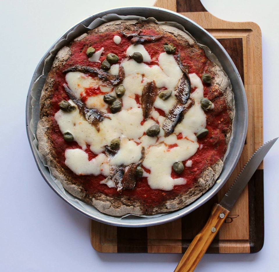 Pizza di grano saraceno con acciughe e capperi