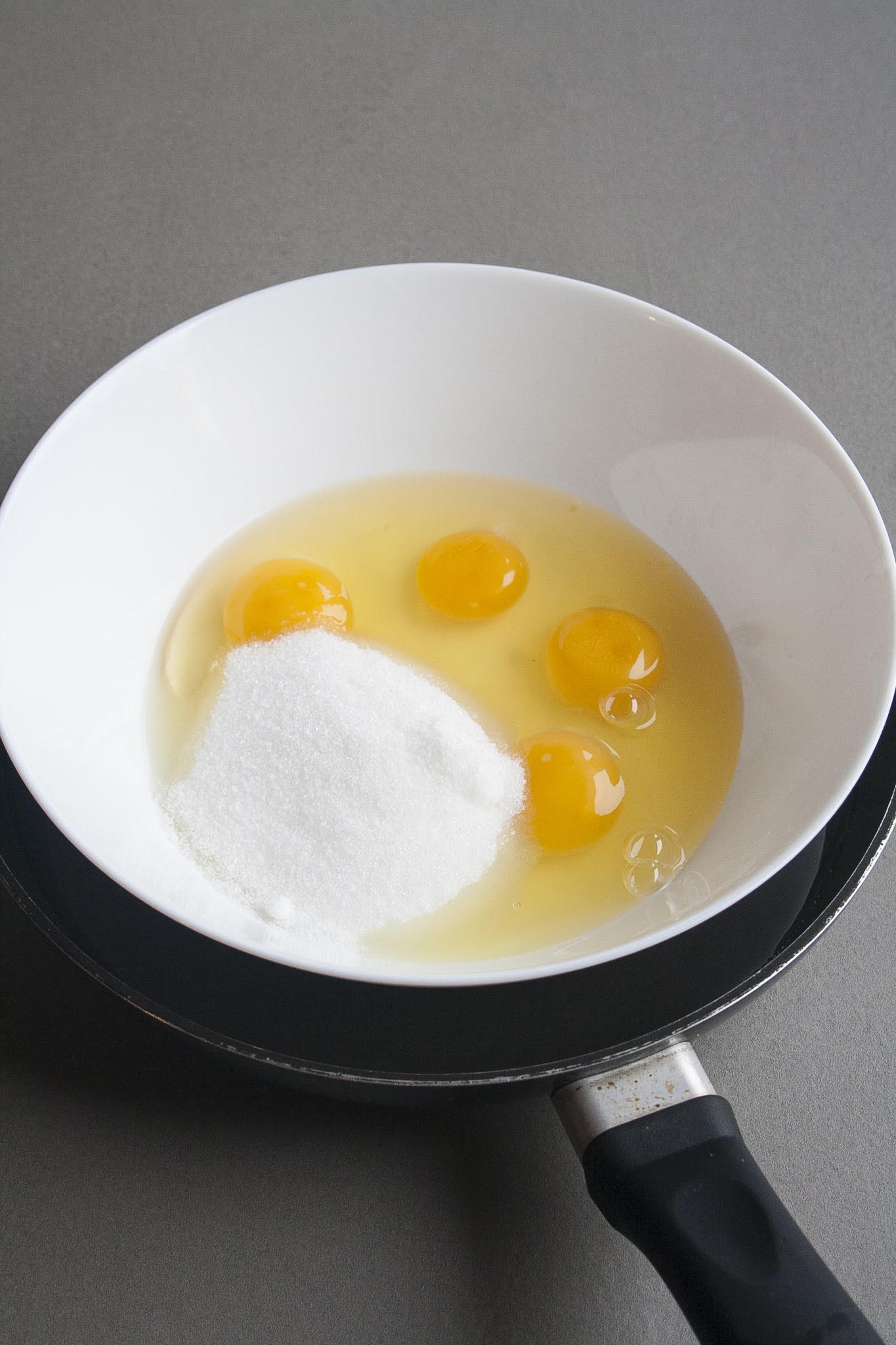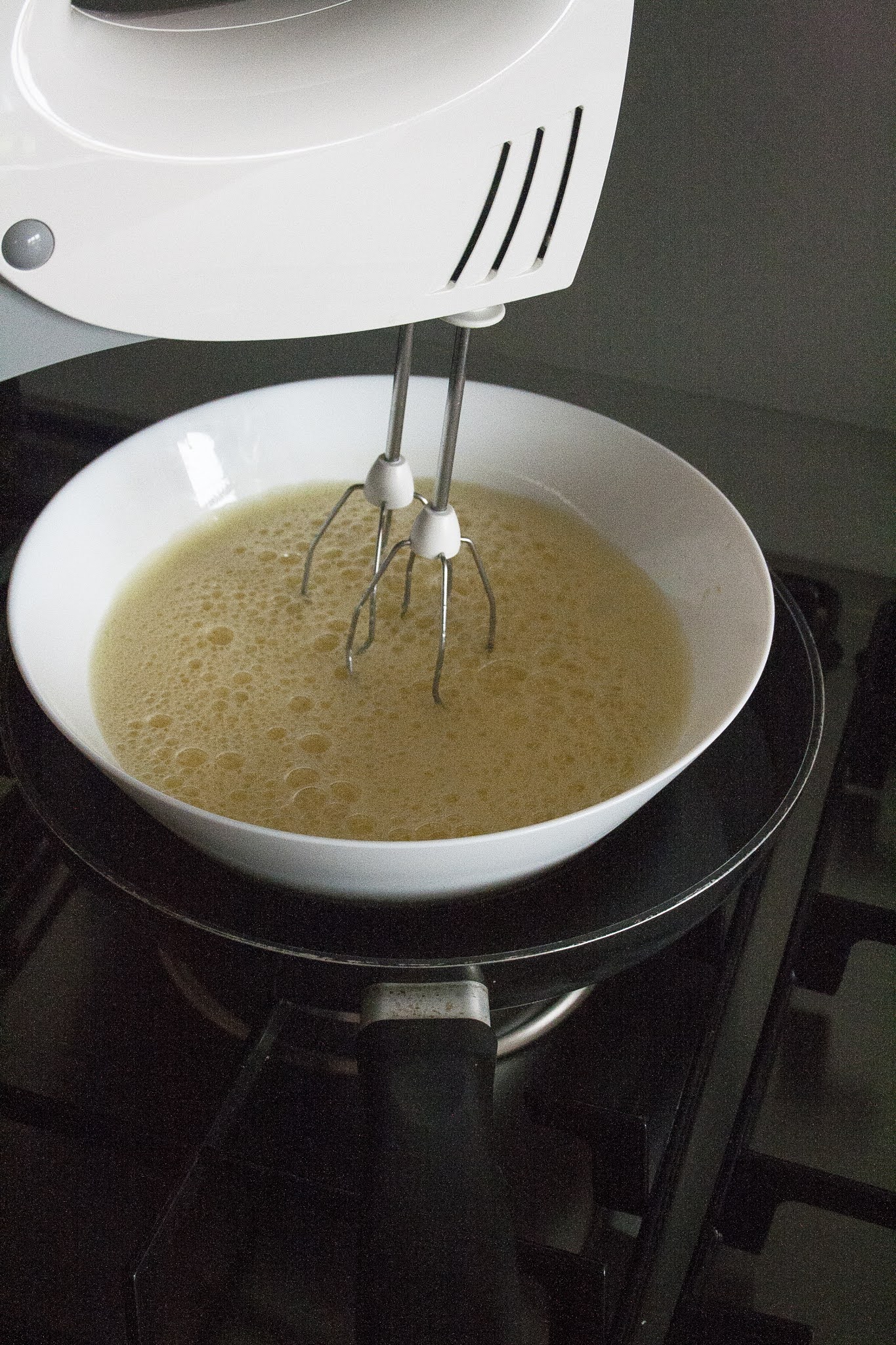 Sistemate una ciotola (resistente al fuoco) all’interno di un pentolino con all’interno un po’ d’acqua messo sopra la fiamma molto bassa del fornello e montate le 4 uova con i 120 g di zucchero semolato utilizzando le fruste elettriche.
