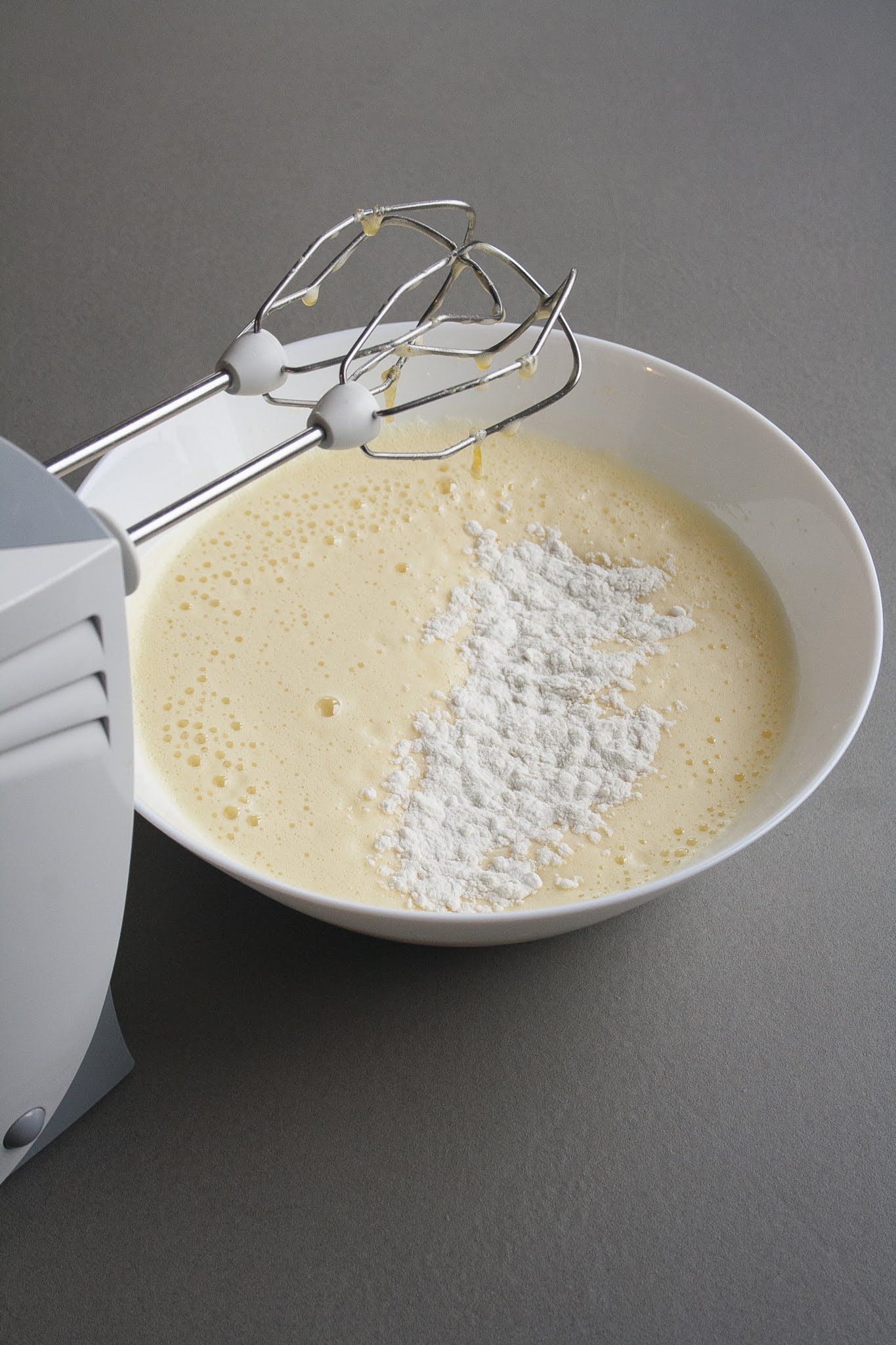 Ottenuto un bel composto spumoso e soffice di volume triplicato (è essenziale incorporare aria nell’impasto essendo senza lievito), togliete la ciotola di uova dal pentolino e continuate a montare con le fruste elettriche finché il composto non si sarà raffreddato.
