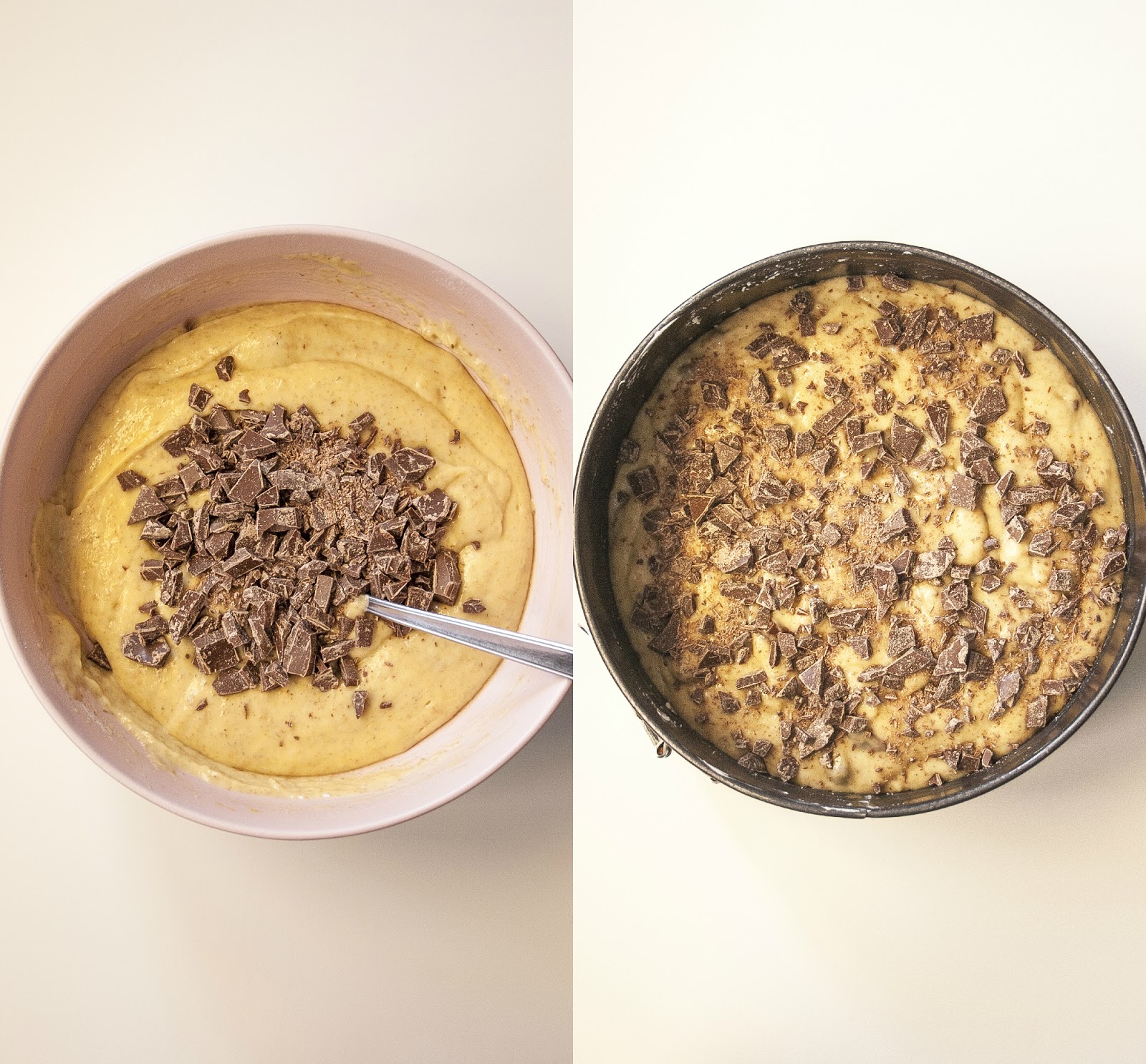 Foderate lo stampo con la carta forno (oppure infarinatelo e imburratelo), versate l’impasto, livellatelo e aggiungete sopra l’ultima manciata di cioccolato leggermente infarinato (questo eviterà che il cioccolato sprofondi nell’impasto).