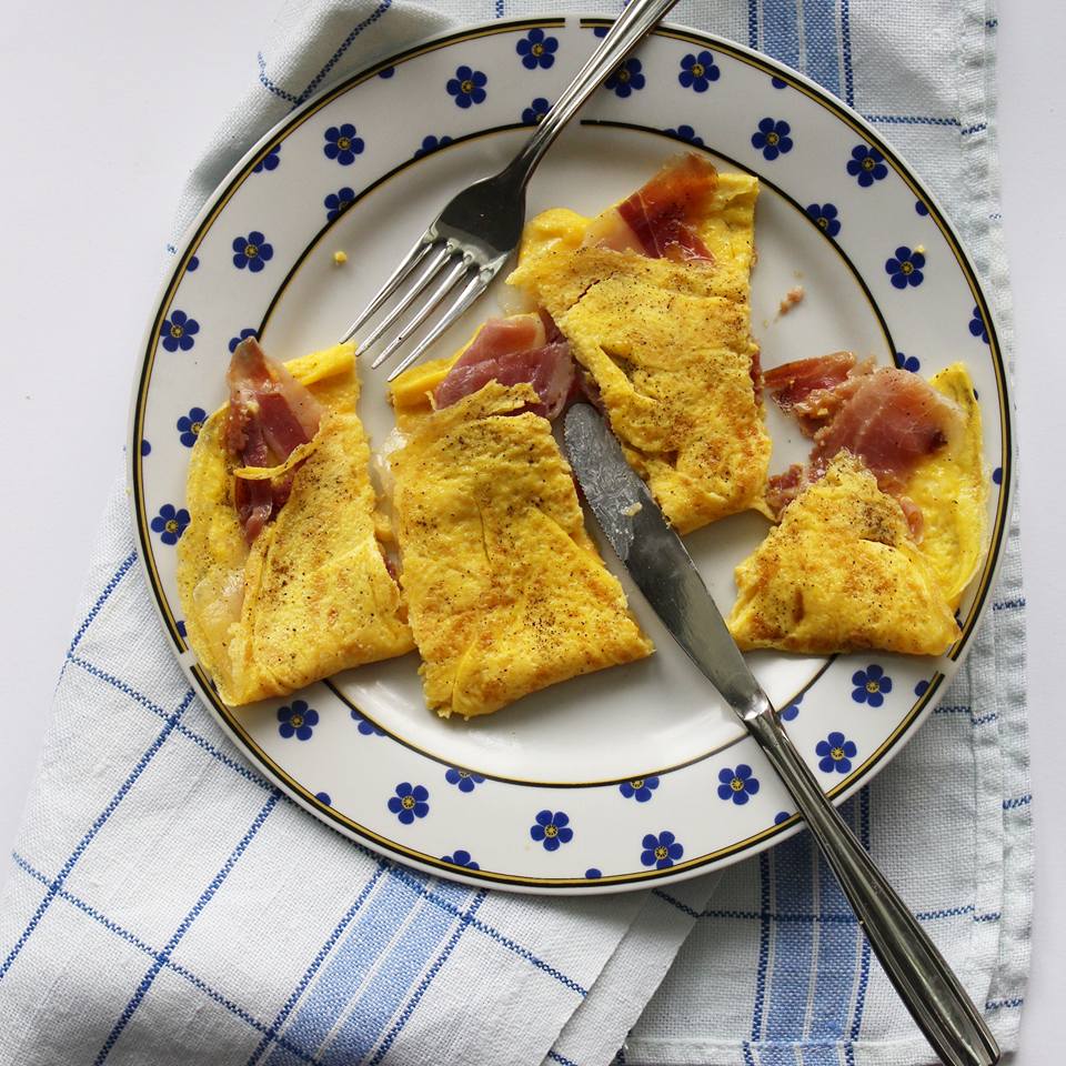 Sbattiamo le uova e il latte con i rebbi di una forchetta, in una piccola boule. Saliamo leggermente. In una padella, invece, scaldiamo il burro e copriamo bene tutta la superficie di essa. Versiamo le uova sbattute con unico gesto e roteiamo la padella per far scivolare tutto il composto. Quando la superficie è quasi rappresa, sistemiamo le fette di prosciutto su metà omelette e richiudiamo. Serviamo subito con una spolverata di pepe.