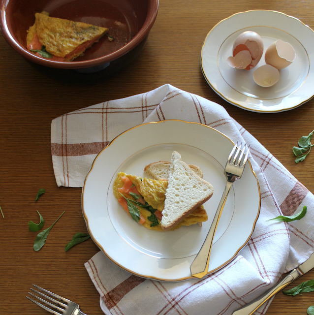 {Uno scrigno di bontà, racchiuso in una frittata. Salmone affumicato, perfetto quando si ha bisogno di una coccola in più. Un piatto caldo che non tiene conto delle stagioni, sempre buono da mangiare. Sempre goloso e godurioso. Foglie di rucola fresca, perché dopotutto siamo ancora in estate e abbiamo bisogno di qualcosa che ce lo faccia ricordare. Poca spesa, massimo risultato!}