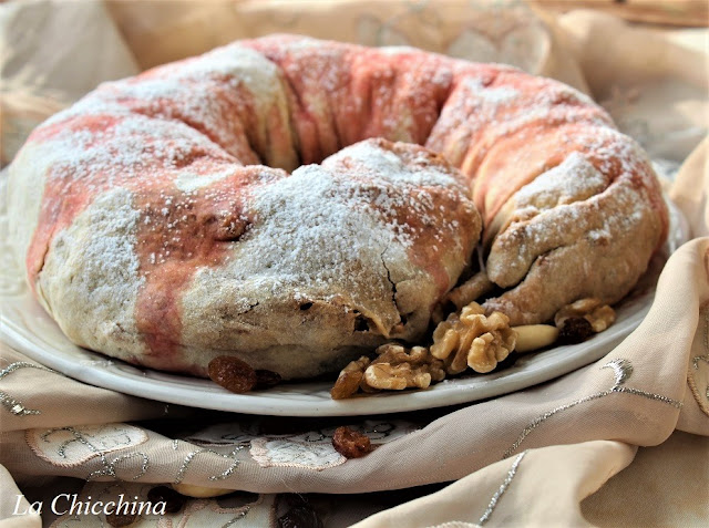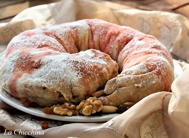 Passato il tempo di riposo, stendere una sfoglia sottile e realizzare un rettangolo con dimensioni 60×40 (circa eh?) distribuire la farcia lasciando liberi tre centimetri lungo tutto il perimetro del rettangolo di sfoglia; arrotolare quindi strettamente la sfoglia e adagiarla sulla placca del forno rivestita con l’apposita carta. Formare una spirale, spolverare con zucchero a velo e infornare in forno preriscaldato per il tempo indicato.