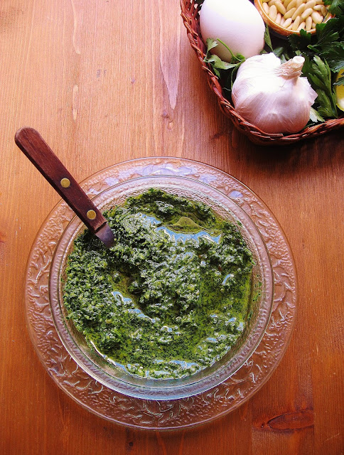 Salsa Genovese (Sarsa de Zena): gemella della salsa verde dalla quale si differenzia per la presenza, tra gli ingredienti, di olive verdi e acciughe salate (che io utilizzo, però, anche nella salsa verde).