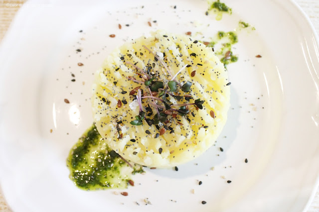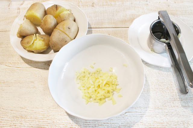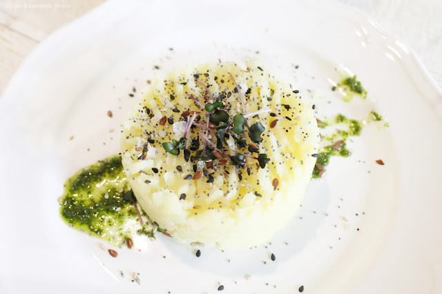 Lessare le patate intere, con la buccia (per non perdere i nutrienti in acqua) e precedentemente lavate, in acqua bollente non salata fino a che non riuscirete a infilzarle con i rebbi di una forchetta. Ora, una volta cotte, schiacciatele da calde direttamente con lo schiaccia patate (la buccia rimarrà all’interno di esso e quindi potrete evitare la noiosa parte di sbucciare le patate e ustionarvi le dita). Condire le patate con abbondante olio evo e sale a piacere. Io ho accompagnato le patate schiacciate con dell’emulsione al prezzemolo, germogli di rucola, semi oleosi e qualche fiocco di sale Maldon.