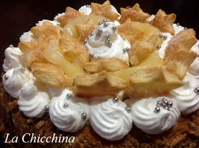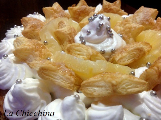 Continua la serie di compleanni che tra Giugno e Luglio mi spingono a sfornare in maniera compulsiva una torta dietro l’altra. Questa è per la Maria, la mia mamma….per lei volevo fare una torta cremosa, ricca di frutta e panna…ecco allora questa torta a strati, farcita con crema pasticcera, ananas, panna montata e stelline di sfoglia… tutti ingredienti che fanno brillare gli occhi alla Maria!