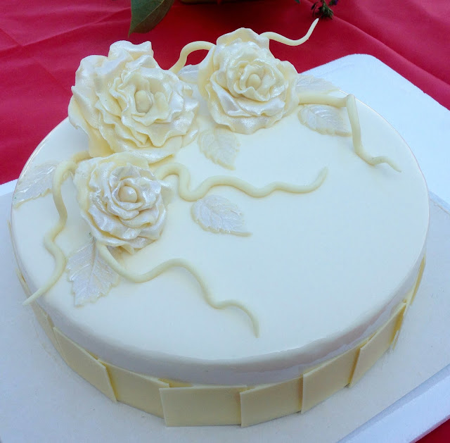 Decorate il perimetro con delle placchette di cioccolato bianco temperato, leggermente sovrapposte, e disponete i decori in cioccolato plastico.