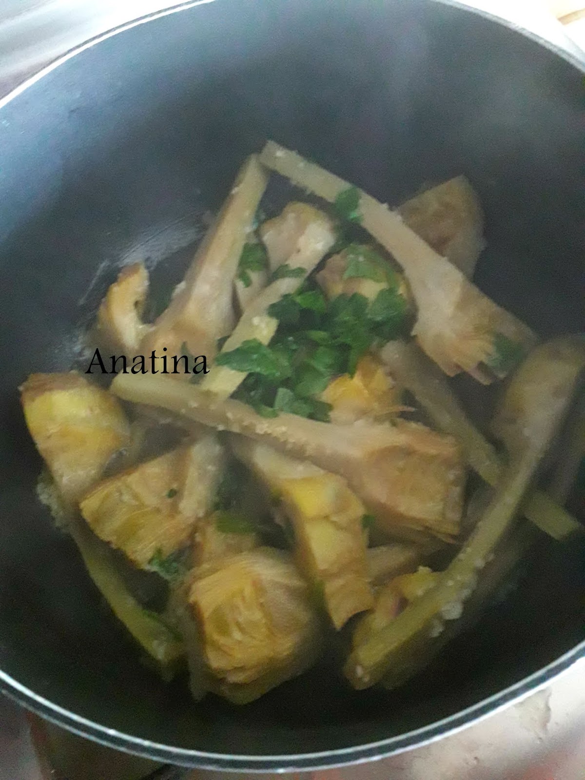 il liquido aggiungere i carciofi,salare,pepare e terminare la cottura ,se occorre con altro liquido!