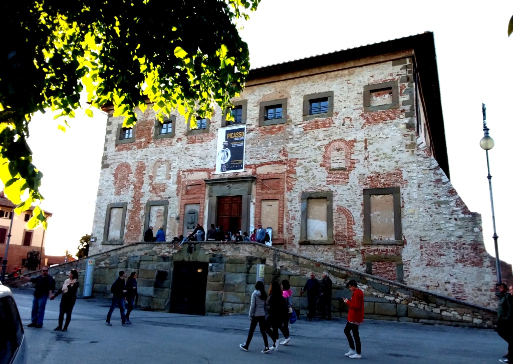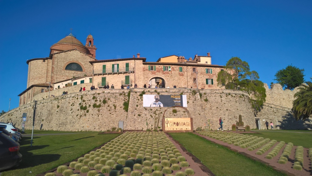 Alla fine del corso, veramente carino da percorrere, si apre un piazzale su cui sorge il Palazzo Ducale detto anche della Corgna, poichè la sua costruzione avvenne nel 1563 per volere di Ascanio della Corgna, signore del luogo. Attualmente ospita una mostra dedicata a Picasso. Purtroppo, data l’ora tarda, stanno per chiudere. Però ci siamo affacciati alla sala d’ingresso ed abbiamo scoperto che è tutta decorata da eleganti affreschi. Sullo smartphone, infatti, leggiamo che anche le altre sale sono affrescate, ad opera del Pomarancio, e tra queste spicca la Sala delle Gesta di Ascanio della Corgna, la cui residenza e studio si trovano al primo piano.