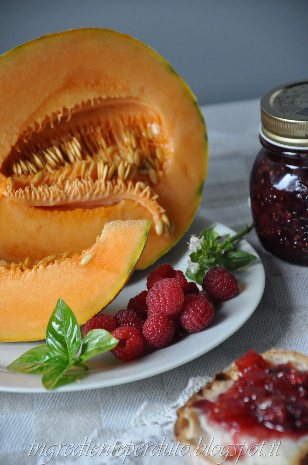 Allora i miei tre ingredienti: lamponi, melone e basilico, mi sono chiesta se fosse possibile metterli insieme, e di nuovo sono partita alla ricerca e guarda un po’, ho trovato la confettura di melone, lamponi e basilico di Sigrid Verbert, autrice dello splendido blog Il Cavoletto di Bruxelles