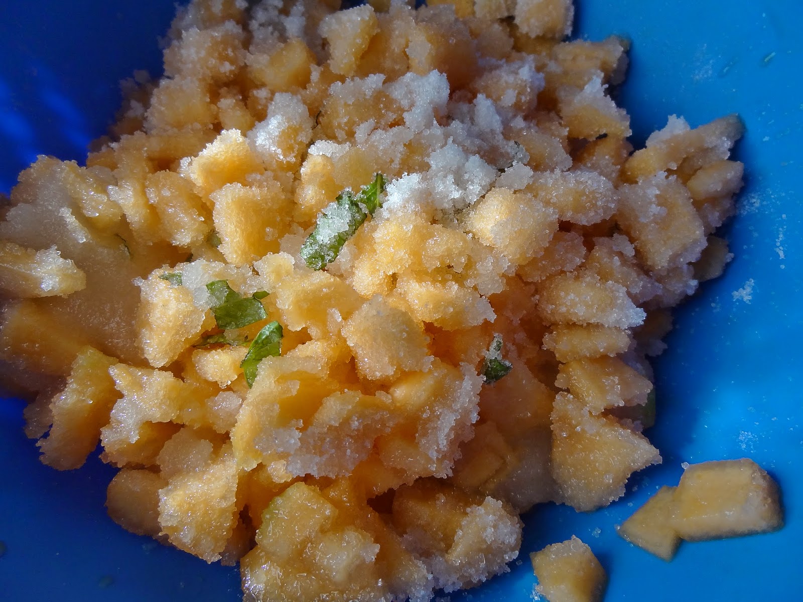 Tagliamo la polpa di melone in piccoli cubetti e in una ciotola li mettiamo con lo zucchero, il succo di limone e le foglie di basilico spezzettate, lasciamo marinare per un’ora circa.