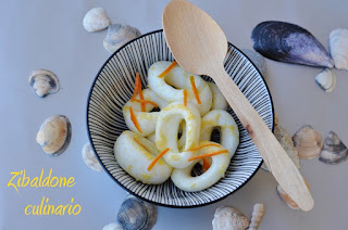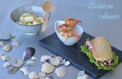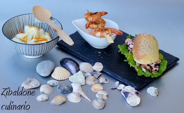 Così ho pensato alle mazzancolle (crostacei), alle seppie (molluschi) e al salmone (pesce) … si lo so il salmone non è prettamente marino, ma se conoscete la canzone in versione integrale, il salmone è citato…eccome!