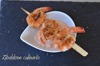 Infilzare in spedini 3 mazzancolle, passarle nella panatura e pressare bene.