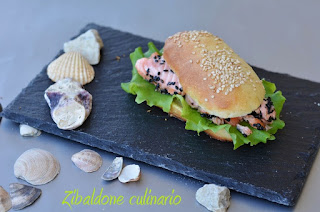Tagliare il panino spalmare la maionese aromatizzata, mettere qualche foglia di lattughino e il salmone “scaloppato” (affettato).