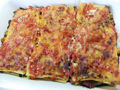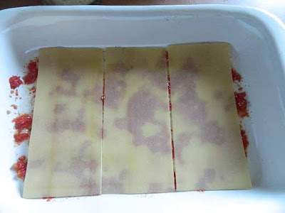 continuare così per tre strati, l’ultimo strato di lasagna va ricoperto solo di polpa di pomodoro e formaggio grattugiato.
