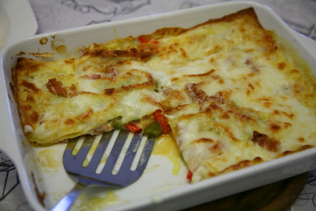 Prendere una teglia da forno e mettere un cucchiaio di besciamella sul fondo. Poi si cominciano gli strati: lasagne, peperoni cotti, besciamella, qualche briciola di bacon e scamorza grattugiata.