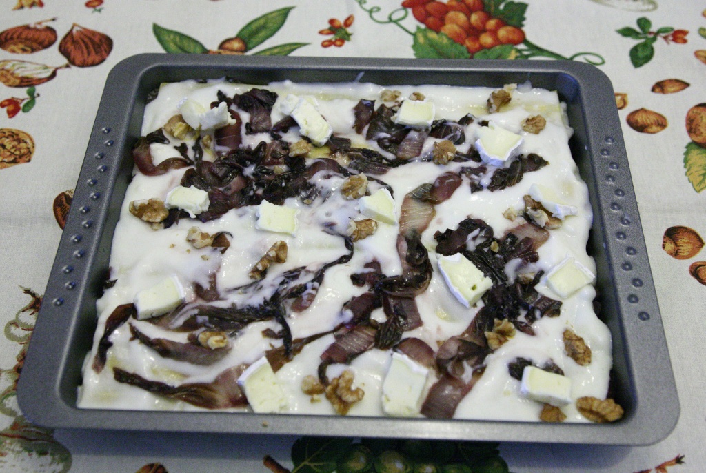 Prendere una teglia da forno e mettere un cucchiaio di besciamella sul fondo. Poi si cominciano gli strati: lasagne, radicchio stufato, besciamella e brie e noci a pezzetti. Terminare con la besciamella e il brie e qualche pezzetto di noci.