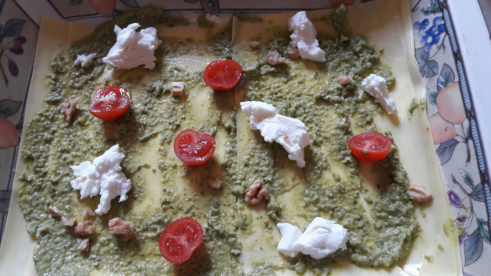 spalmate il pesto, mettete qualche cucchiaiata di stracchino qua e là e così i pomodorini.