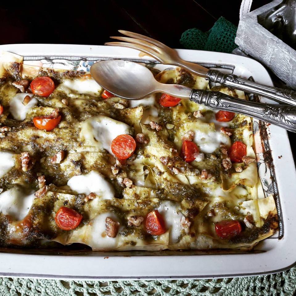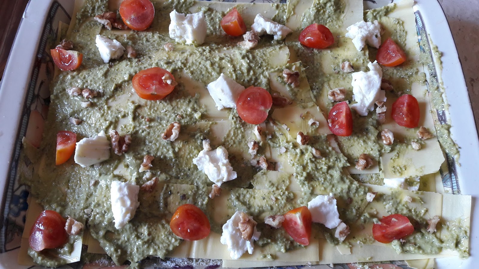 Spalmate un po’ di pesto sul fondo della teglia, adagiatevi le sfoglie di lasagna,