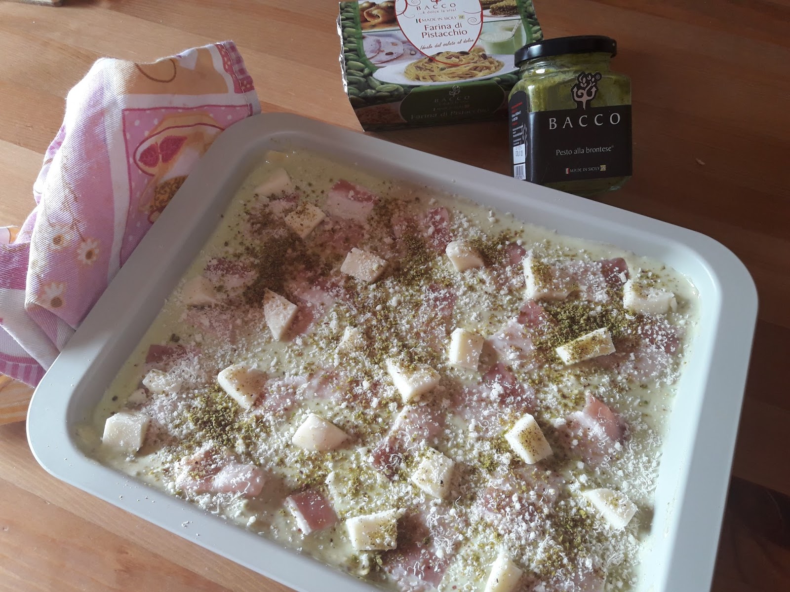 Mettere qualche cucchiaio di besciamella al pistacchio sul fondo della teglia e posizionare le sfoglie di lasagna, se occorre, ritagliare l’eccesso con un coltello, mettere abbondante besciamella al pistacchio, la pancetta tagliata a fette, i pezzi di formaggio, una bella spolverata di grana e una spolverata di granella di pistacchi.