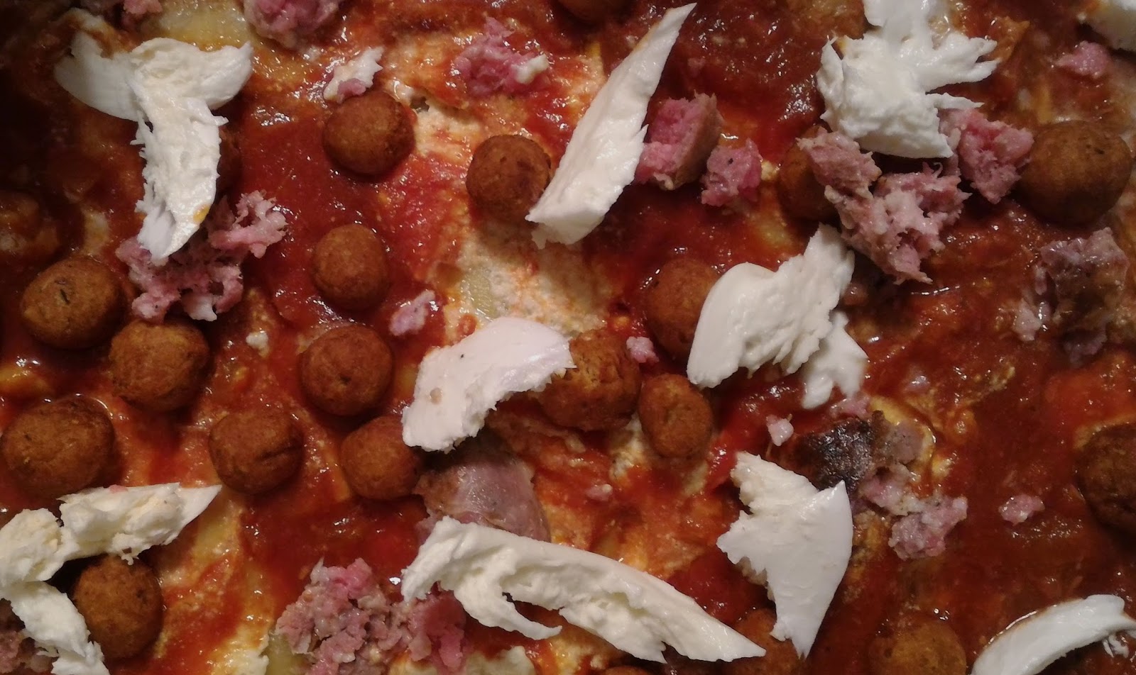 Stendetevi uno strato di lasagne, ponetevi sopra uno strato di ricotta, irroratela con poco sugo, aggiungete le polpette, le fettine di mozzarella e quelle di salsiccia.