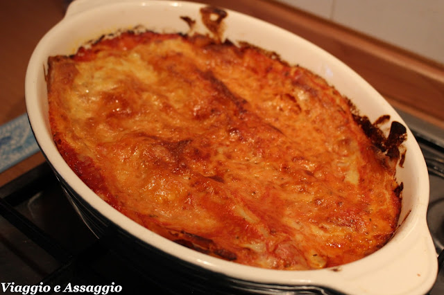 Pour little sauce on the baking pan, then add tomato sauce and sheet of lasagna. Continue until all ingredients are used. Bake in a preheated oven at 200 ° C for about 40-45 minutes or until golden brown.