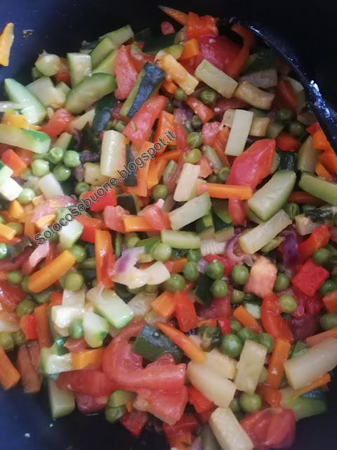 Dopo pochi minuti versiamo anche le zucchine e il peperone tagliati tutti a pezzetti. A metà cottura aggiungiamo anche i pomodori. Saliamo e portiamo a cottura per circa 15 minuti.
