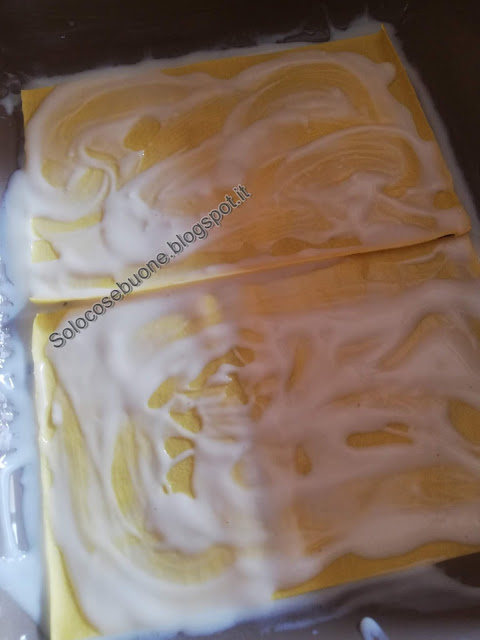 In una teglia imburrata mettiamo una cucchiaiata di besciamella, quindi aggiungiamo le sfoglie di pasta all’uovo