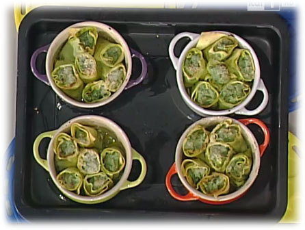 Preparare un panetto di pasta e lasciarlo riposare per 30 minuti circa. Nel frattempo pulire e privare le bietoline della parte bianca e lessare in poca acqua salata. Scolare, strizzare e frullare nel mixer fino ad ottenere una crema liscia ed omogenea. In una ciotola lavorare la ricotta fino a renderla morbida, unire la purea di bietoline, aggiustare di sale e aromatizzare con un pizzico di noce moscata. Preparare le lasagnette, stendere le strisce di impasto lasciandole spesse un paio di cm. lessare le sfoglie di pasta in acqua bollente salata e nel frattempo imburrare generosamente una pirofila. Scolare le lasagnette al dente, arrotolarle su se stesse e disporre i rotolini in piedi, molto vicini nella pirofila. Farcire ogni rotolino con la crema di ricotta e bietoline, cospargere con abbondante formaggio grana grattugiato, irrorare con il restante burro fuso e infornare a 200° per 8-10 minuti fino a leggera doratura. Servire ben calde.