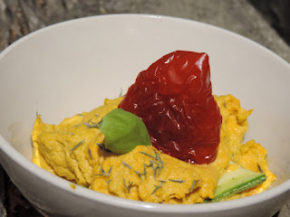 100 gr anacardi Cibo Crudo (www.cibocrudo.com), 240 gr carote (3 – 4 carote), basilico, acqua, sale integrale, 3 zucchine, pomodori secchi (www.cibocrudo.com), timo.