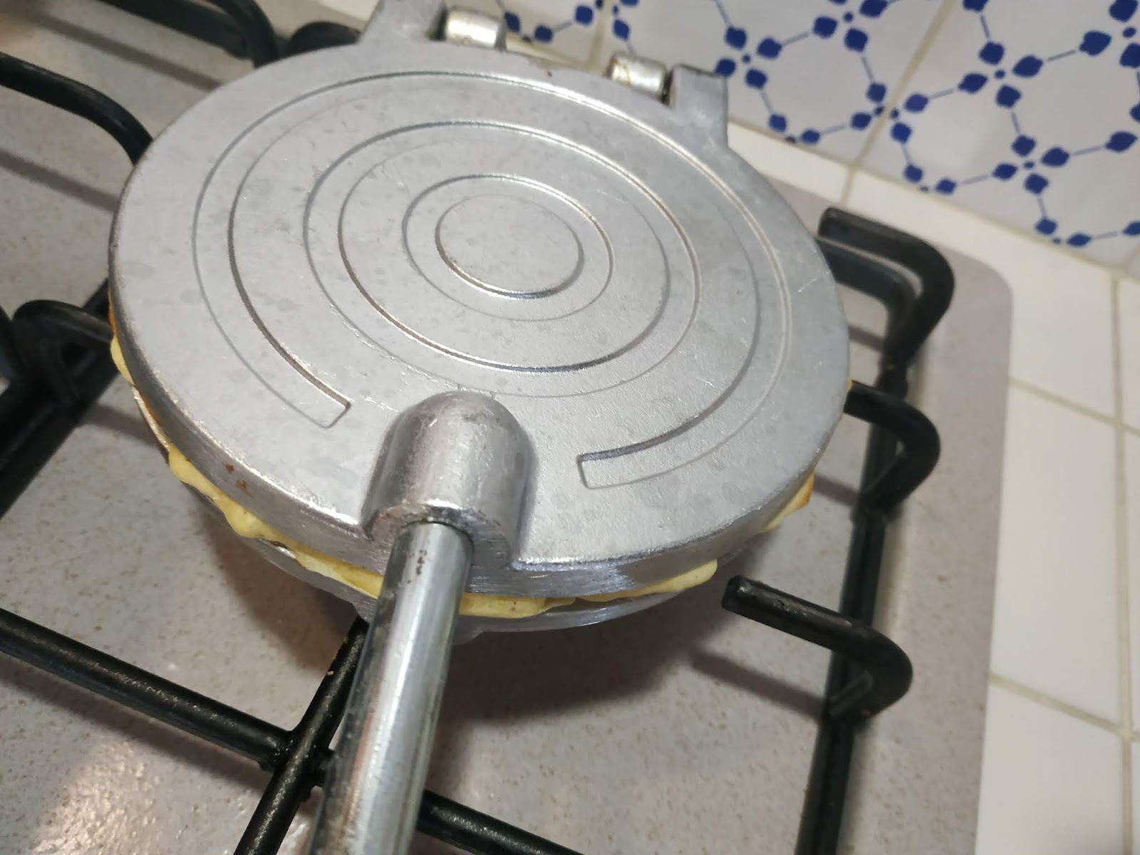 Chiudete con la parte superiore e fate cuocere per 1 minuto per parte. Ogni ferro ha un disegno particolare, mi hanno raccontato che anticamente ogni famiglia ne avesse uno diverso.