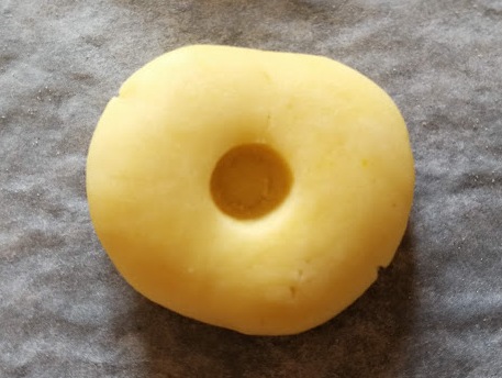 Appiattire un poco e formare il foro al centro con l’estremità di una cucchiaio di legno.