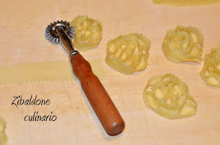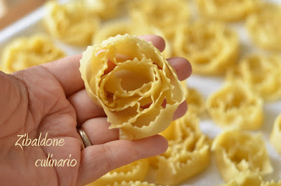Stendere la pasta molto sottile (ultimo foro della sfogliatrice) e tagliare delle strisce larghe 4 cm e lunghe circa 40 cm con l’apposita rotellina tagliapasta. Piegarle a metà per il lato lungo e mettendo “in piedi “, unendo i due lembi, ogni 3 cm circa, formando delle cullette.