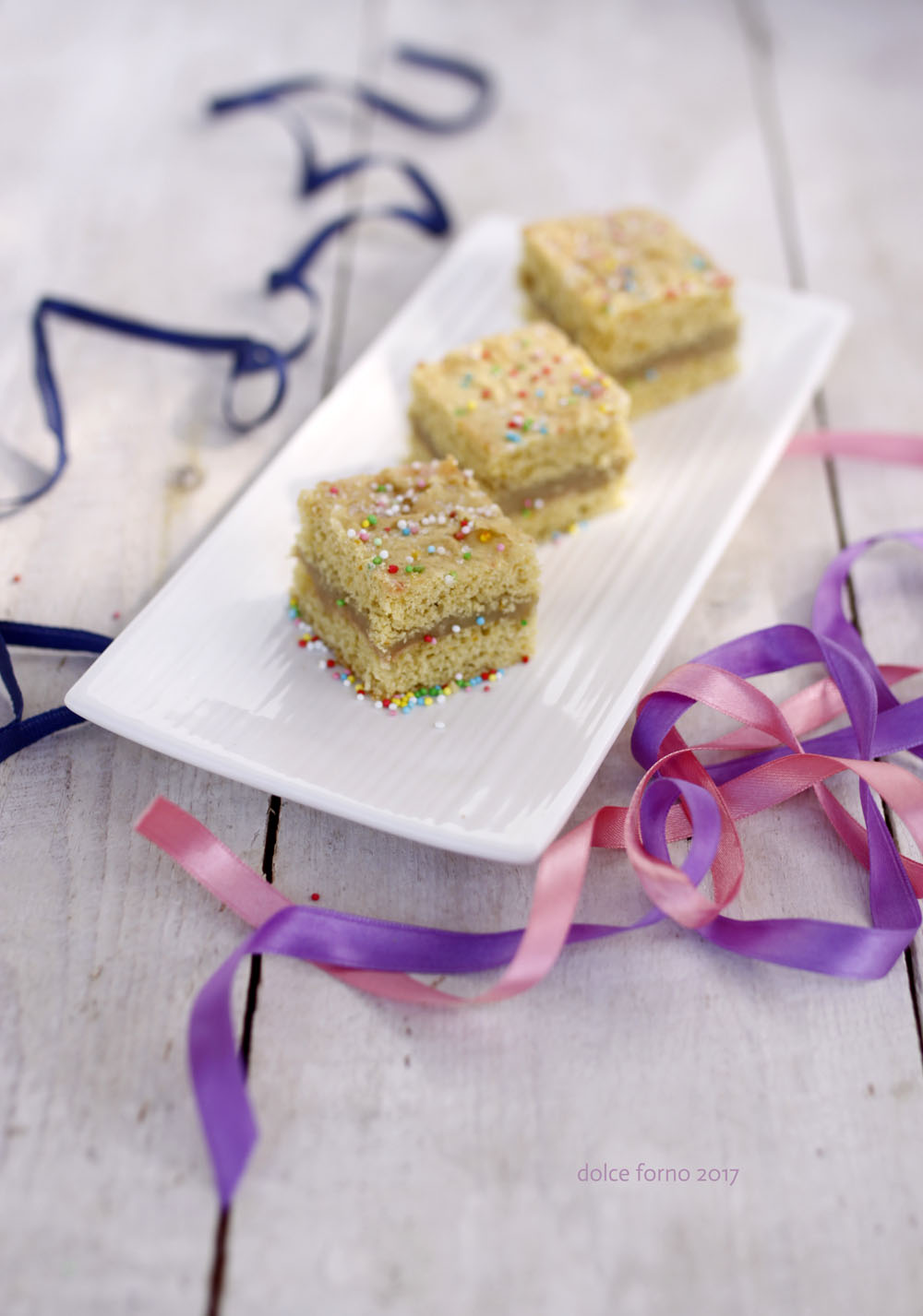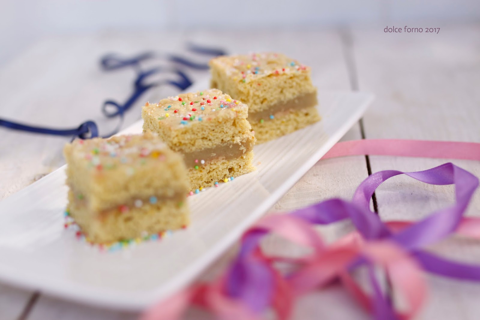 Separa i tuorli dagli albumi, monta a neve gli albumi con il pizzico di sale, riserva in frigorifero. Monta i tuorli con lo zucchero, unisci le bucce di agrumi grattugiate, il liquore e l’olio poco alla volta. Unisci gli albumi ai tuorli con movimenti dal basso verso l’alto per non smontare l’impasto. Sciogli l’ammoniaca nella bevanda all’avena intiepidita, attendi che produca una abbondante schiuma e aggiungi alla montata di uova. Setaccia la farina con il lievito e unisci alle uova. Versa l’impasto sulla spianatoia, lavora brevemente, cerca di non aggiungere farina. Se l’impasto fosse troppo appiccicoso lascia riposare coperto per un’ora o più, ma non dovrebbe essere necessario se rispetti le dosi e lo maneggi delicatamente. Dividi a metà l’impasto e stendilo sottile su un foglio di carta forno di misura della teglia, usa il matterello e poca farina. Spennella la superficie di bevanda all’avena e distribuisci la mompariglia, premendo leggermente così che rimanga attaccata. Accendi il forno a 200° statico, inforna a metà altezza e cuoci per 8/9 minuti, il tempo che la pasta colori leggermente. Fai molta attenzione quando dovrai aprire il forno per togliere la sfoglia cotta, il vapore e l’odore dell’ammoniaca sono forti, fai questa operazione con la finestra aperta e senza bimbi in cucina. L’odore si dissolverà rapidamente e, sia nell’ambiente che nel dolce, non ne rimarrà traccia. Ripeti con l’altra metà di impasto. Fai raffreddare su di una griglia, senza carta forno. Prepara la crema, fai bollire la bevanda all’avena con la buccia degli agrumi, unisci lo zucchero, fai sciogliere, aggiungi la farina e mescola molto bene per non fare grumi. Rimetti sul fuoco e fai bollire per qualche minuto. Ora aggiungi il liquore, mescola, togli le bucce e distribuisci la crema su una sfoglia. Ricopri con l’altra sfoglia decorata con la mompariglia. E’ il classico dolce più buono il giorno dopo, quando tutti i sapori si sono amalgamati, da servire in piccoli tranci. E’ consigliabile conservare in frigorifero, coperto con pellicola, per la presenza della crema.
