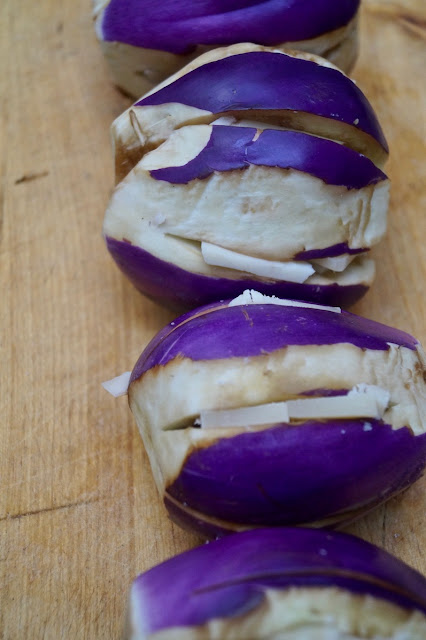 Prendete la melanzana in una mano e incidetela con quattro o cinque tagli profondi ma non troppo devono arrivare a meta’ melanzana