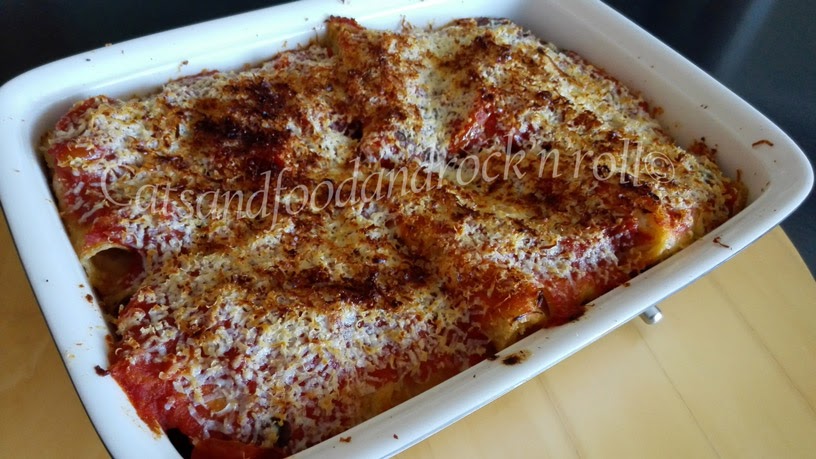 Io me le sono immaginate in una versione molto basic, con un ripieno di sola ricotta di pecora, fresca e cremosa, e un condimento profumato di pomodoro e basilico, concedendomi, come unica nota un filino più gourmet, una finitura di ricotta di capra affumicata grattugiata in superficie, per esaltare la gratinatura.