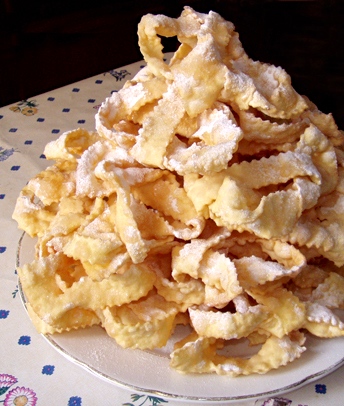 Allora continuiamo a farci del male , ma solo per il breve periodo di carnevale ; anzi i nutrizionisti dicono che mangiare il fritto ogni tanto darebbe una sferzata al metabolismo e quindi non è poi così da evitare assolutamente se preso a piccole dosi , come del resto tutti i cibi ; Ho preso questa ricetta dal mio vecchio Artusi del 1973 , un nome una garanzia e devo dire che non mi ha delusa . A Bologna si chiamano sfrappole e sono così leggere e friabili che come le ciliegie , una tira l’altra ma sono veramente un dolce italiano , cambia solo il nome ; crostoli , cenci , chicchere ……;