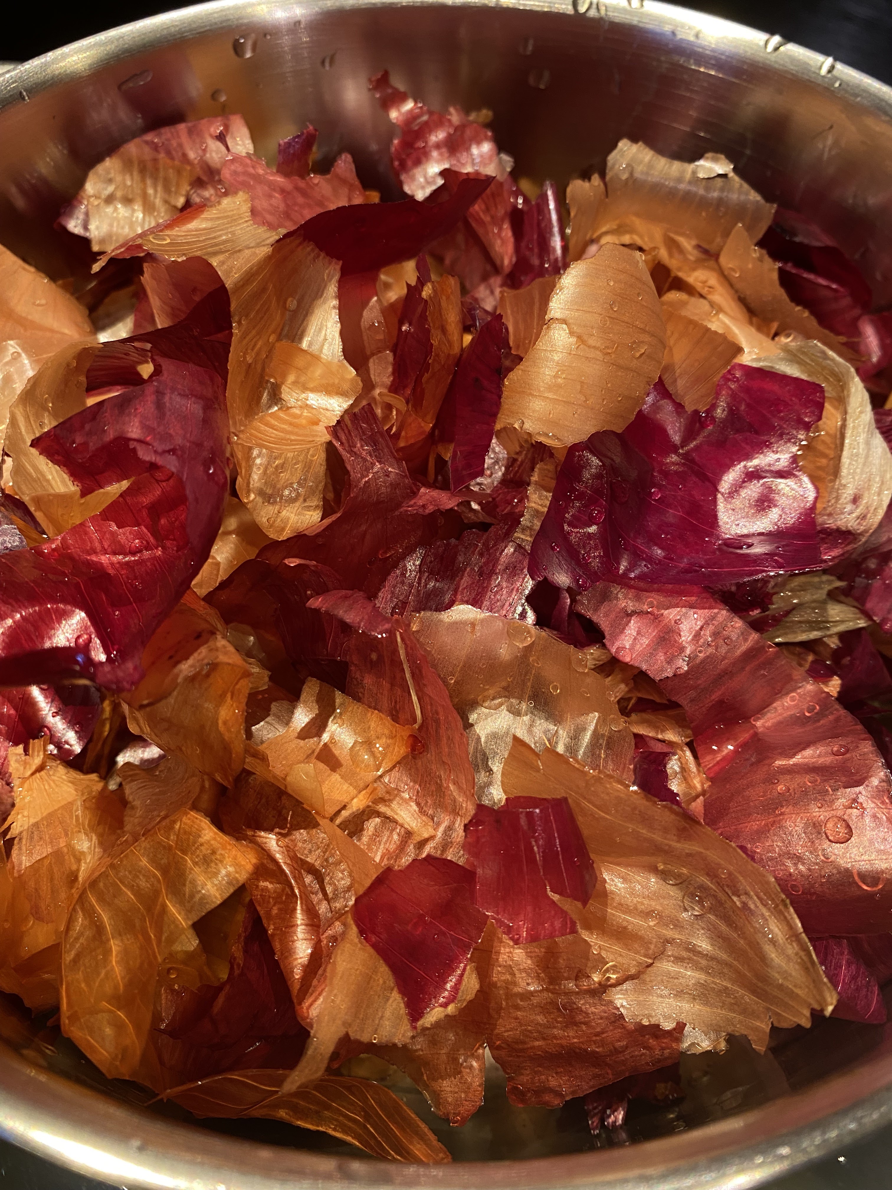 In una pentola si mettono delle sfoglie di cipolla gialla e rossa (ci vogliono tante per ottenere un bel colore) e si fanno bollire per circa un’ora in moda da rilasciare il colore.