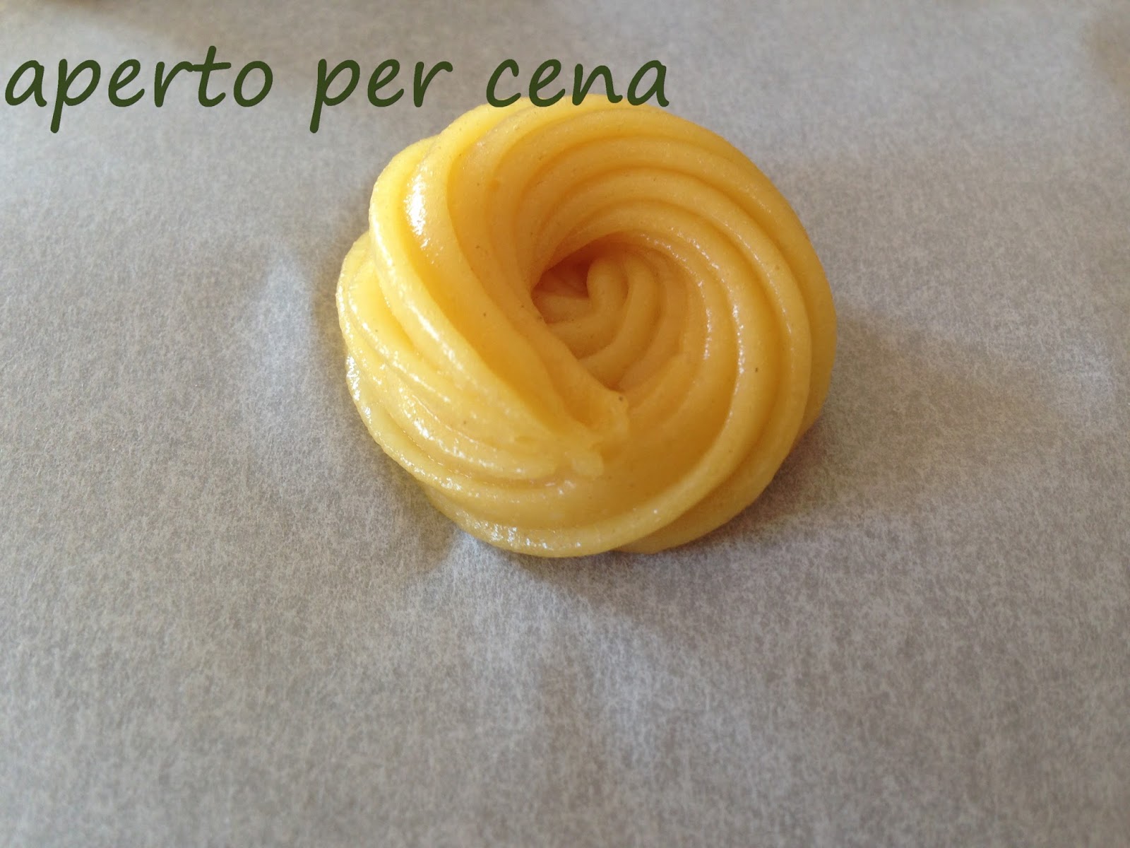 Rivestiamo le teglie con carta da forno e iniziamo a formare le zeppole, lasciamo uscire dalla sacca un po’ di impasto, che formerà il centro della base, poi ci muoviamo in senso circolare per formare due anelli sovrapposti, tiriamo via con un colpo secco per chiudere il cerchio. Ripetiamo per formare le altre zeppole mantenendo la giusta distanza per non farle attaccare durante la cottura.