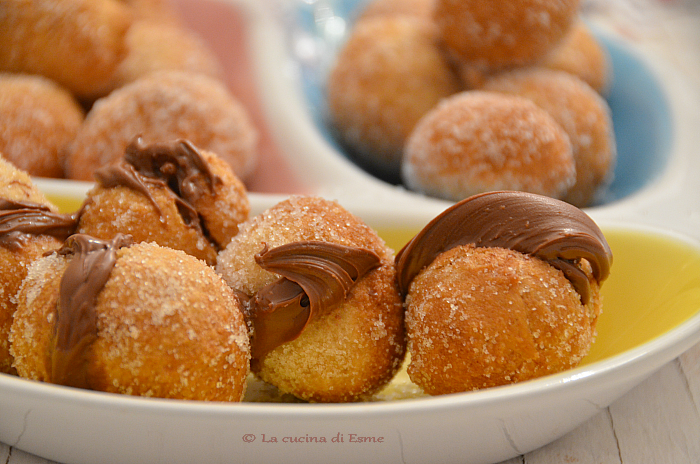 Inserite nella ciotola della planetaria, con la foglia, la farina ed il lievito e azionate un paio di giri per far respirare la farina. Inserite poi 150 ml di acqua fresca di rubinetto e azionate a velocità 1 appena il composto prende consistenza, inserite il gancio e passate a velocità 2. Quando l’impasto si sarà avvolto intorno al gancio, fermate la planetaria, lasciate cadere l’impasto dal gancio e formate al centro una piccola buca al cui interno inserirete 10 ml di acqua e 5 gr di sale. Riabbassate il gancio e azionate nuovamente, sempre a velocità 2, per circa 10 minuti, a circa metà del tempo inserite anche l’olio. Lasciate lievitare per circa tre o quattro ore nella ciotola dell’impastatrice, coperta e al caldo. Io ad esempio impasto la mattina per poi friggere per merenda. Mettere a scaldare l’olio per la frittura, ricordatevi che per controllare facilmente la temperatura basterà inserire uno bastoncino di legno nell’olio, quando intorno si formeranno delle bollicine è il momento di iniziare a friggere. Lasciando l’impasto nella ciotola dove ha lievitato staccate dei piccoli pezzi e arrotolateli tra i palmi delle vostre mani e poi immergeteli direttamente nell’olio. Friggete poche palline per volta, passatele prima su carta da cucina e poi immediatamente nello zucchero semolato. Quando avrete finito di friggere tagliatele a metà, ma non completamente e farcitele con la Nutella e … godete!
