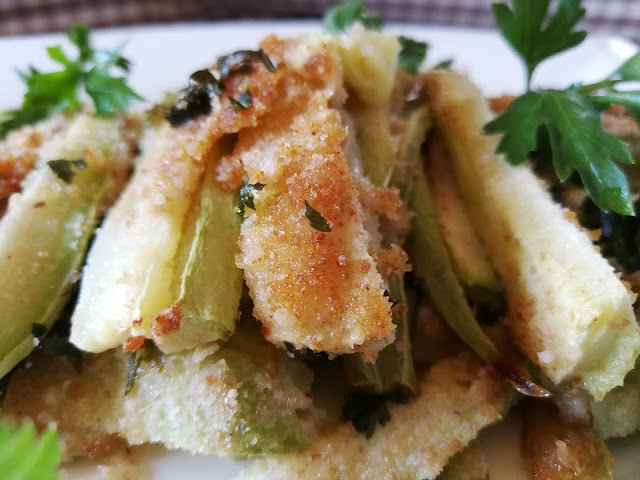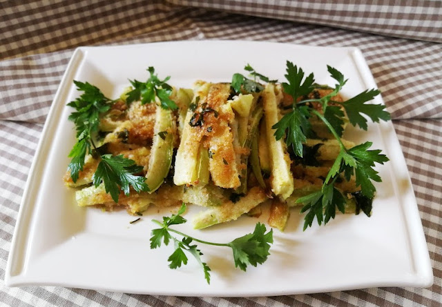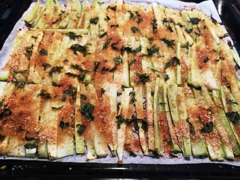Salare, pepare poco, mescolare il pangrattato ( nel mio caso 3 cucchiai e 1/2 di aglio in polvere) e cospargere le zucchine..