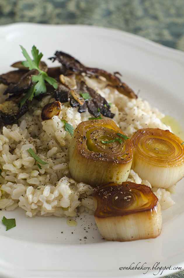 La ricetta originale prevedeva del riso nero al posto di quello integrale che ho utilizzato io ed i funghi non vengono sfumati con un cucchiaio di aceto bianco.