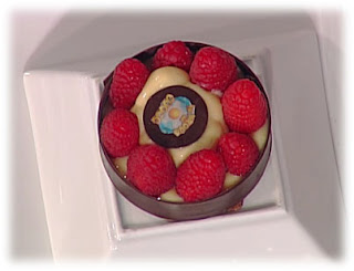 Sciogliere la massa di cacao, aggiungere il fruttosio ed amalgamare il tutto con i cereali. Miscelare tra loro i tuorli, il fruttosio e amido di riso setacciato, a parte portare a bollore il latte di riso con la vaniglia. Unire i due composti e riportare a bollore. Raffreddare. Composizione del dolce: in un cerchio di cioccolato, fondente oppure bianco, adagiare il composto ai cereali. Procedere con uno strato sottile di crema pasticcera di riso. Guarnire con lamponi freschi o frutta a piacere e rifinire con la restante crema di riso. Decorare e servire.