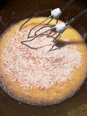 E, poca per volta, la farina auto lievitante mescolata con la fecola, il lievito e lo zucchero di canna…