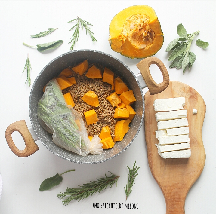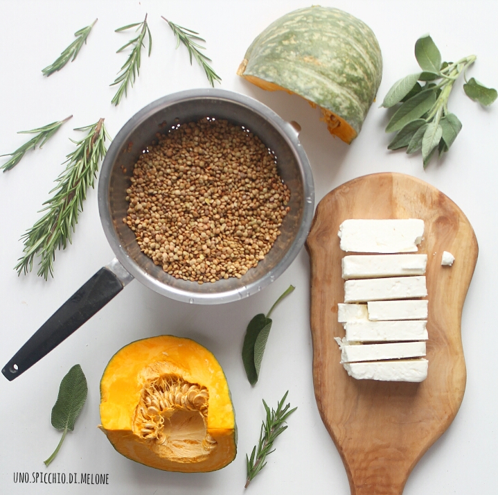 Lavate le lenticchie e mettetele a sbollentare 15 minuti in una pentola con la zucca. Aggiungete i rametti di rosmarino (e/o altre erbe aromatiche), un filo d’acqua, un filo d’olio e un cucchiaino raso di sale grosso.