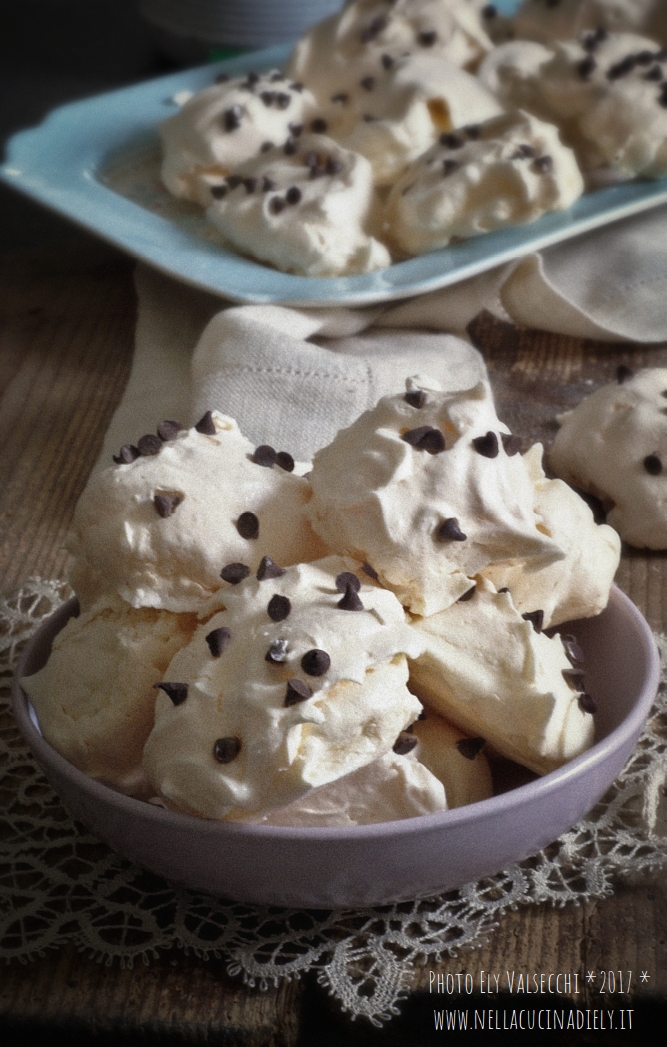 Montate a neve fermissima gli albumi con lo zucchero, preparate le teglie ricoperte di carta forno e formare con il cucchiaio le meringhe, io le ho fatte semplicemente così, senza dare troppa importanza alla forma, qui conta di più la sostanza