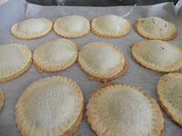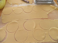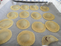 Tagliate del dischi dalla pasta, farciteli con un cucchiaio di farcia e chiudete sovrapponendo un altro disco di pasta. Chiudete bene i bordi premendo con i rebbi di una forchetta.