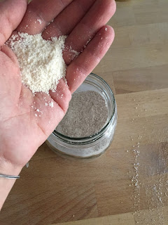 Versare la polvere ottenuta in un barattolo di vetro, possibilmente riempiendolo tutto in modo da no avere spazio tra il composto e il tappo.