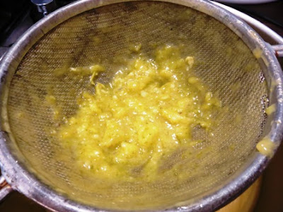 Ora suggerisco alle amiche di filtrare il lime curd ancora un poco fluido perché così sarà più agevole eliminare la buccia grattugiata del limone ed eventuali residui di uovo..Ora porre nuovamente il pentolino nel bagno maria e continuare a cuocere fin quando la crema rimarrà attaccata al cucchiaio…