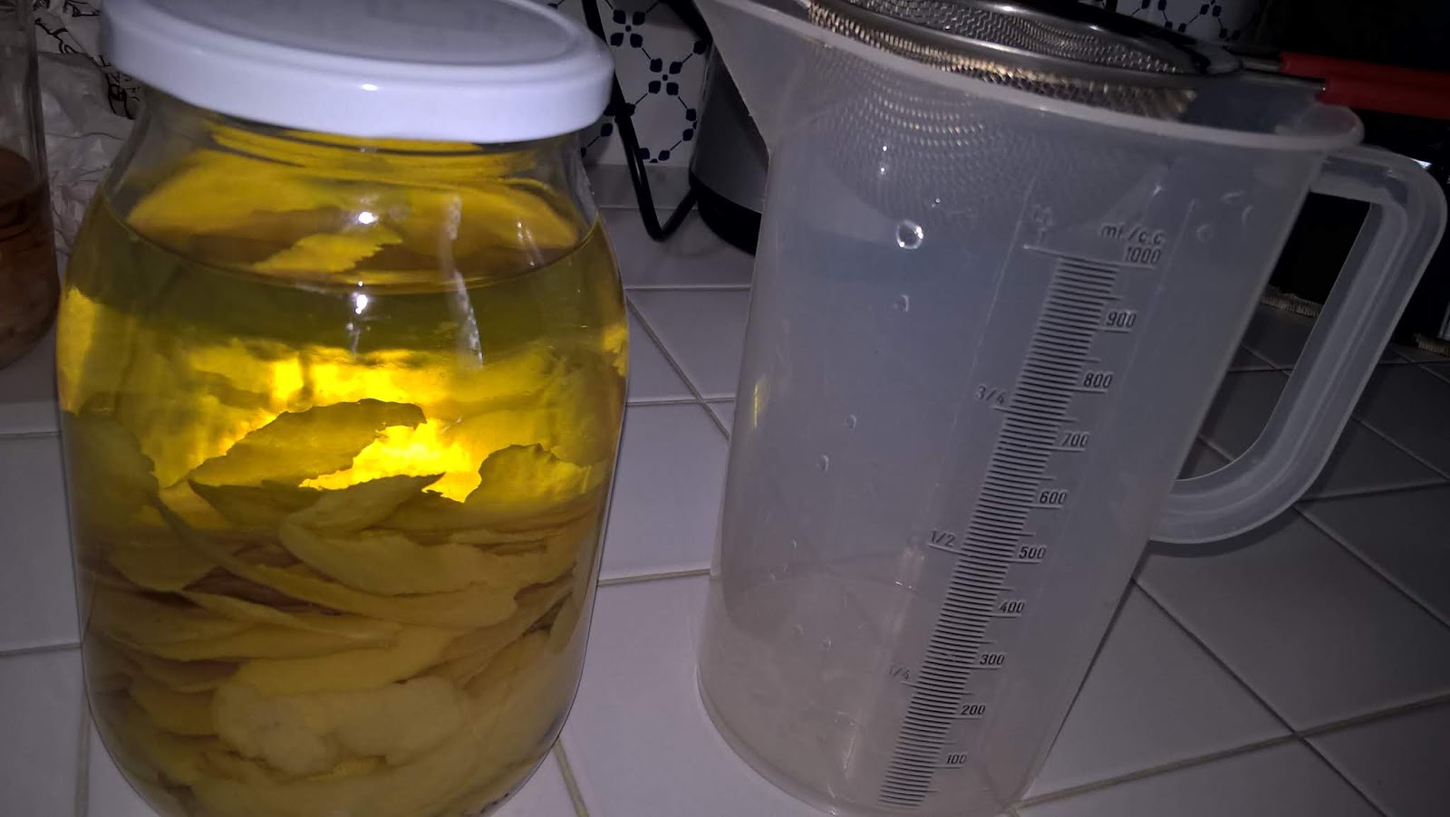 Mettere in infusione le scorze dei limoni (evitate la parte bianca) nell’alcol. Tenete il barattolo al buio per almeno 30 giorni, agitandolo di tanto in tanto.